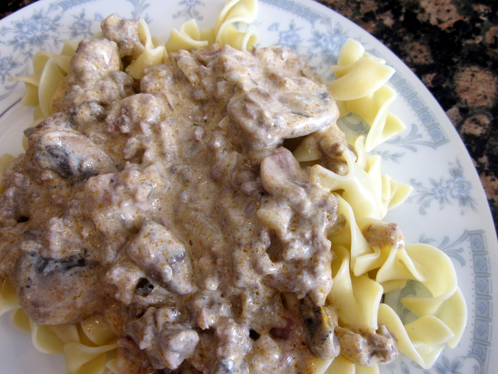 Browned ground beef is simmered with garlic and condensed cream of mushroom soup, then mixed with prepared egg noodles and sour cream.